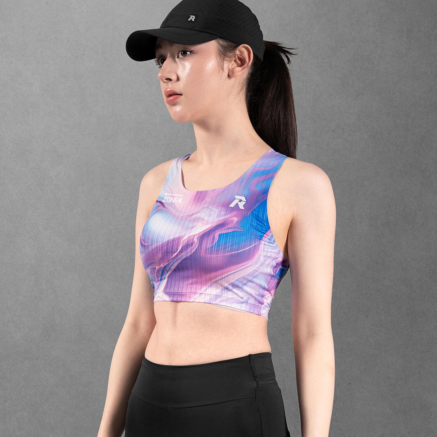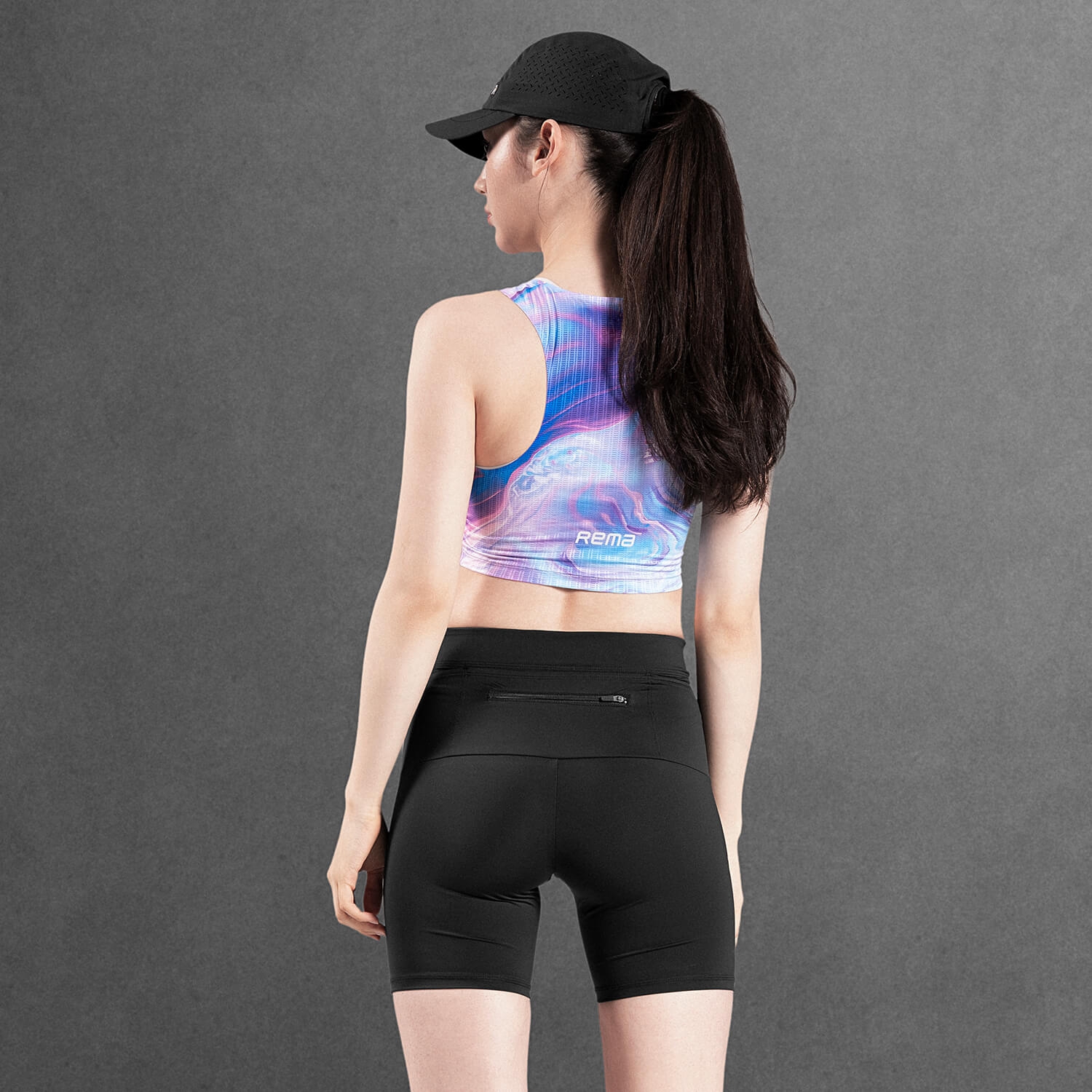 肩背開放式剪裁釋放上身活動範圍,降低肩部束縛;短版版型貼合核心區域,減少跑動時的布料晃動。固定下襬設計則幫助衣身在配速提升時維持定位,不易上移。