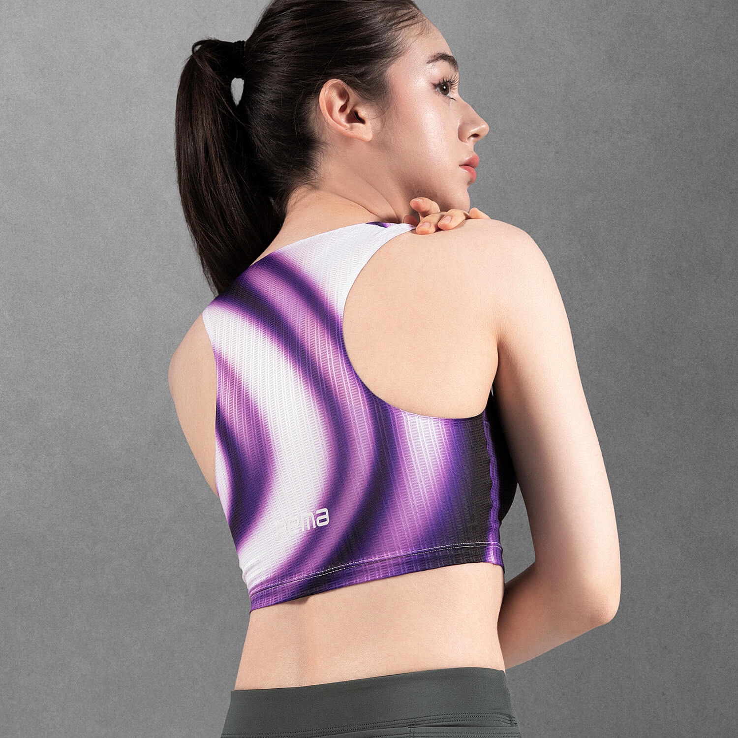 肩背開放式剪裁釋放上身活動範圍,降低肩部束縛;短版版型貼合核心區域,減少跑動時的布料晃動。固定下襬設計則幫助衣身在配速提升時維持定位,不易上移。
