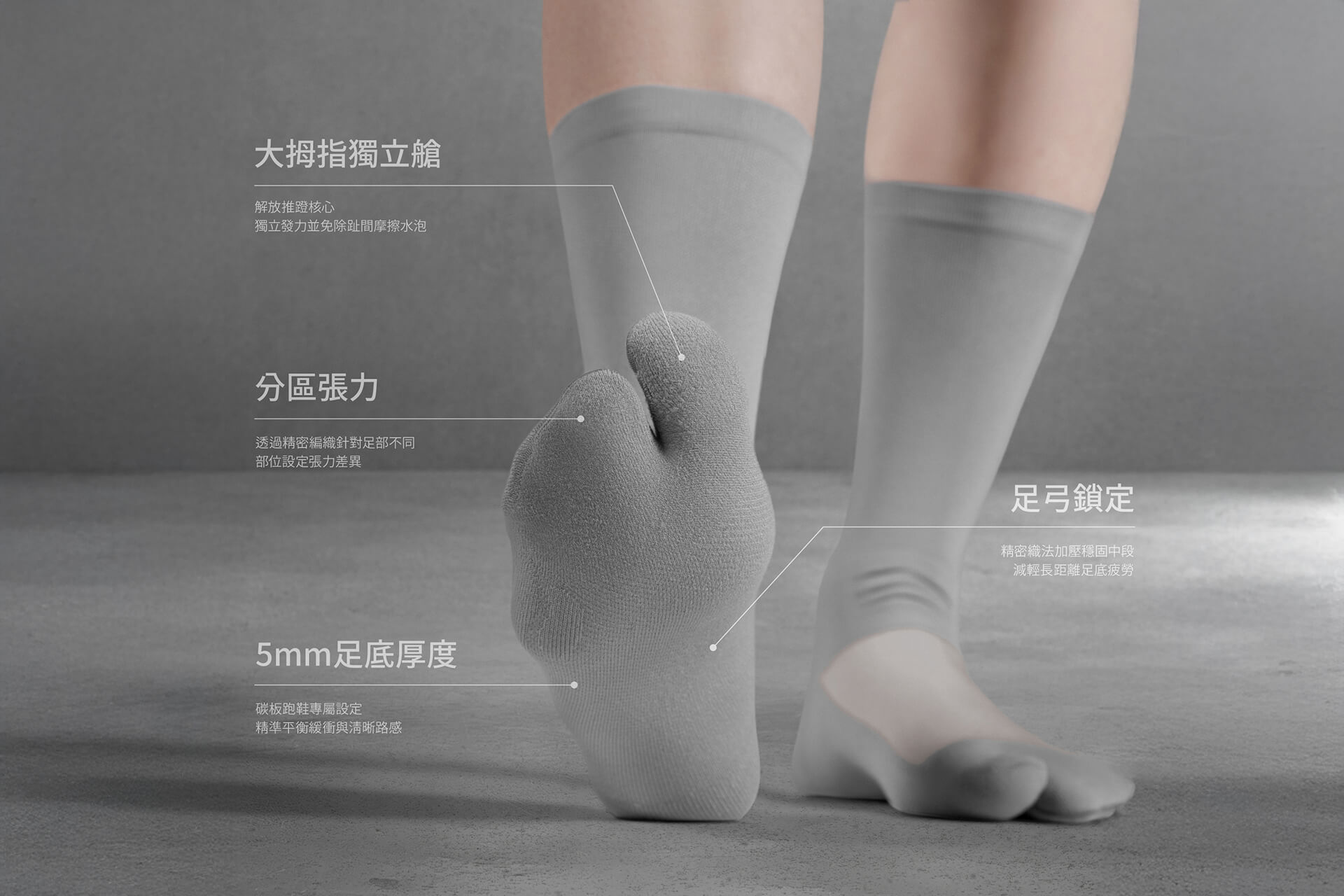 大拇趾獨立發力:將控制平衡與推蹬最重要的大拇趾獨立出來,不僅改善腳掌穩定度,更直接消除了拇趾側摩擦水泡的風險。適應期極短,穿脫比五指襪更直覺。