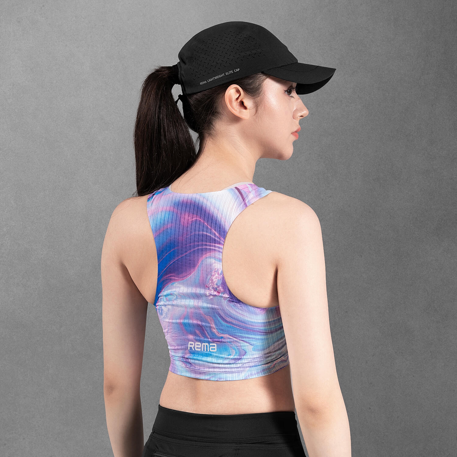 肩背開放式剪裁釋放上身活動範圍,降低肩部束縛;短版版型貼合核心區域,減少跑動時的布料晃動。固定下襬設計則幫助衣身在配速提升時維持定位,不易上移。
